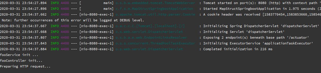 调用 /req 接口后我们发现,不单单 FooController 和 FooService 在第一次调用初始化,连 Spring MVC 核心 DispatcherServlet 都是第一次调用时初始化。