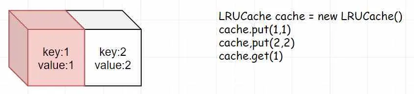 第二步:我们分别向cache里边put(1,1)和put(2,2),这里因为最近使用的是2(put也算作使用)所以2在前,1在后。
