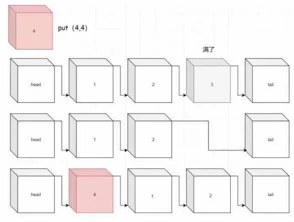 - 第五步:我们继续put(4,4),同理我们将1作废。此时如果get(1),也是返回-1。