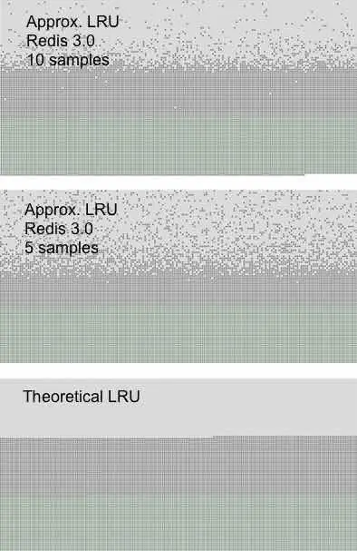 这个图解释一下,绿色的点是新增加的元素,深灰色的点是没有被删除的元素,浅灰色的是被删除的元素。最下面的这张图,是真实LRU的效果,第二张图是默认该参数为5的效果,可以看到浅灰色部分和真实的契合还是不错的。第一张图是将该参数设置为10的效果,已经基本接近真实LRU的效果了。