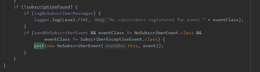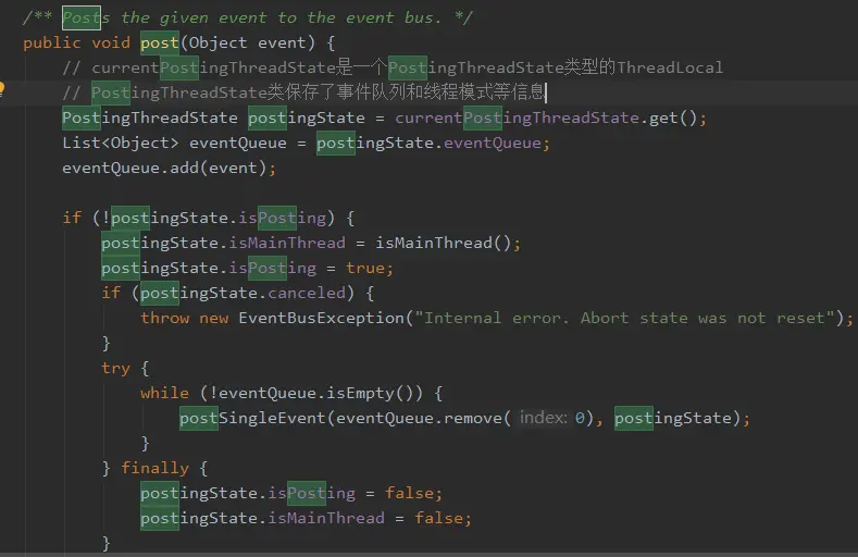 post()方法先将发送的事件保存的事件队列,然后通过循环出队列,将事件交给postSingleEvent()方法处理:
