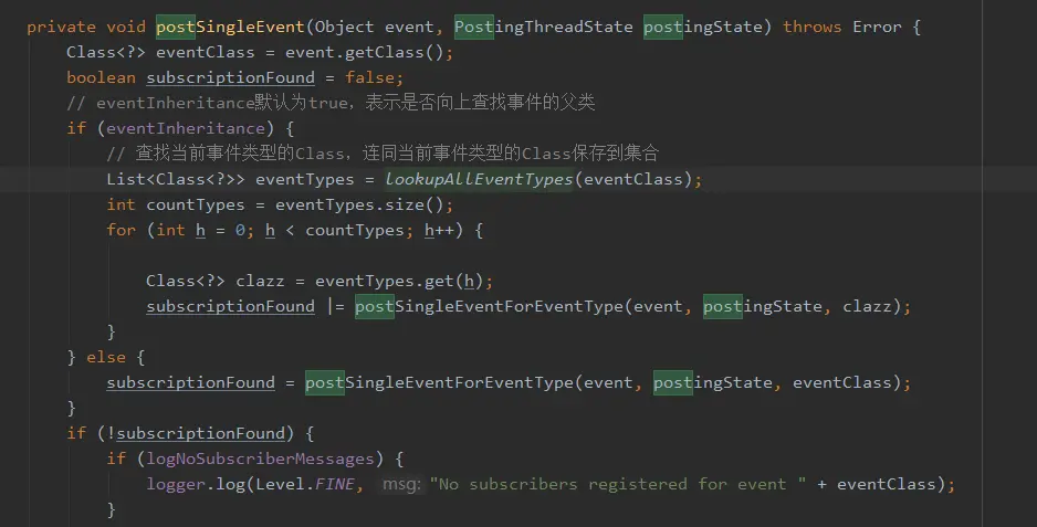 根据eventInheritance属性,决定是否向上遍历事件的父类型,然后用 postSingleEventForEventType()方法进一步处理事件