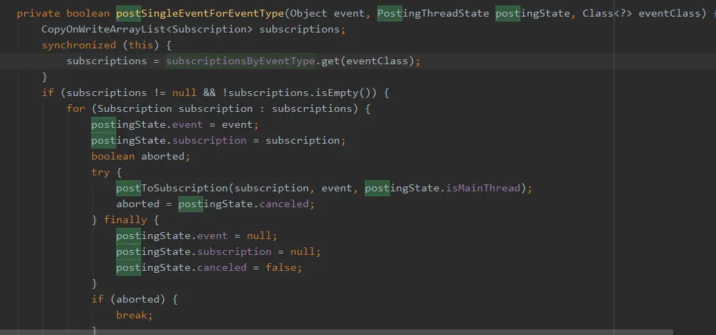 遍历发送的事件类型对应的Subscription集合,然后调用postToSubscription()方法处理事件。