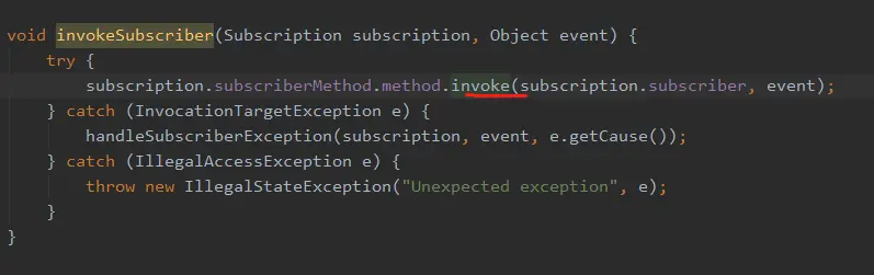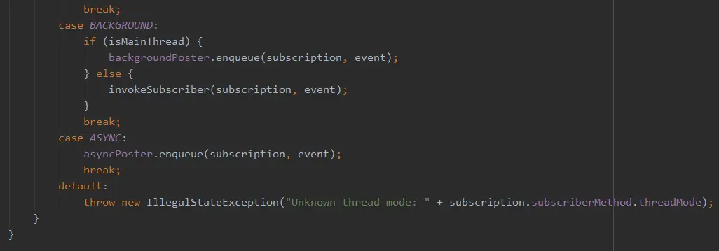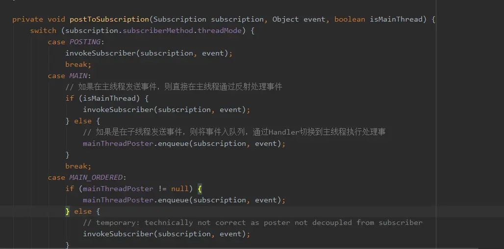 据订阅事件方法的线程模式、以及发送事件的线程来判断如何处理事件,至于处理方式主要有两种: 一种是在相应线程直接通过invokeSubscriber()方法,用反射来执行订阅事件的方法,这样发送出去的事件就被订阅者接收并做相应处理了