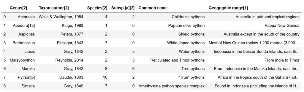 在第二个示例中,我们要从维基百科中抓取数据。我们要抓取的是关于蟒科的表格数据。