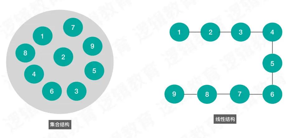 分为:集合,线性,树形(一对多),图(多对多)