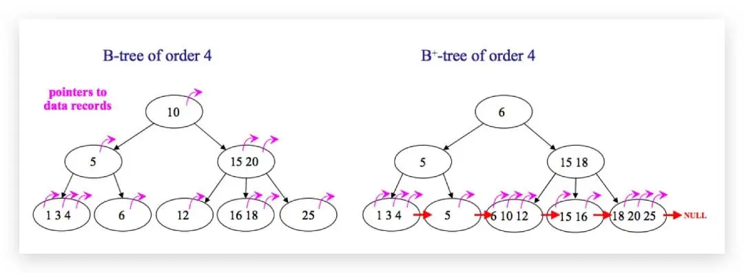 • B-树在提高了磁盘IO性能的同时并没有解决元素遍历的效率低下的问题。B+树的叶子节点使用指针顺序连接在一起,只要遍历叶子节点就可以实现整棵树的遍历。而且在数据库中基于范围的查询是非常频繁的,而B树不支持这样的操作。
