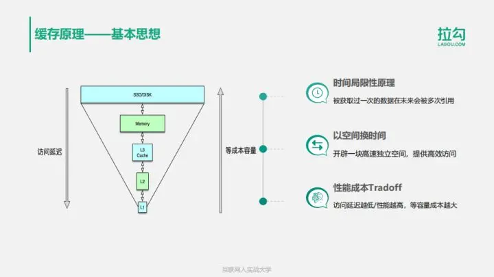 缓存构建的基本思想是利用时间局限性原理,通过空间换时间来达到加速数据获取的目的,同时由于缓存空间的成本较高,在实际设计架构中还要考虑访问延迟和成本的权衡问题。这里面有3个关键点。