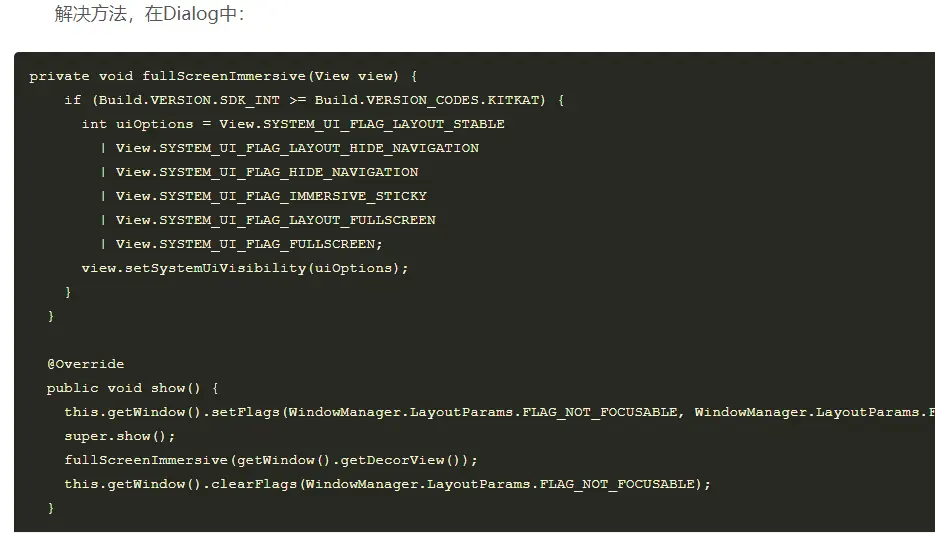 因为app是实现了全屏沉浸式的,发现activity在设置了全屏后,弹出dialog底部会跳出导航栏虚拟键。具体原因是因为Dialog的Window抢走了焦点,Window 中的 DecorView 状态改变导致了退出。