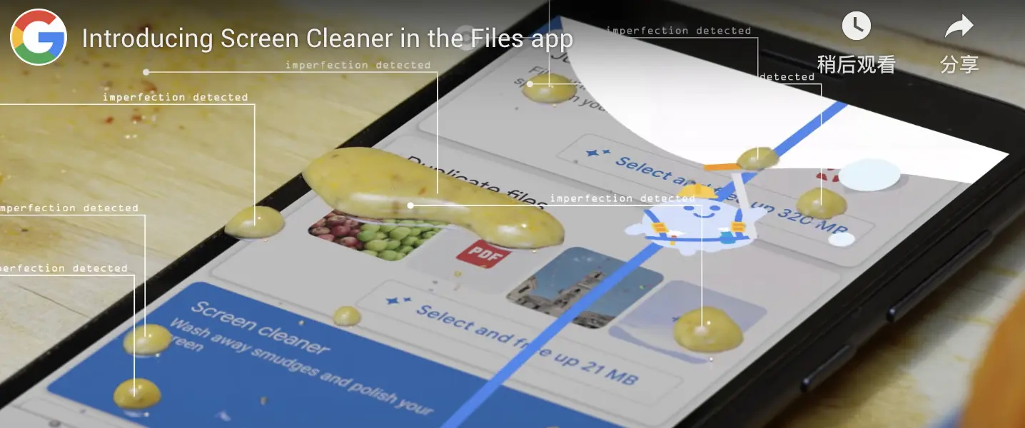 谷歌开发的 Files 应用能够清理设备的内存空间,愚人节当天谷歌推出了屏幕清洁功能,能够“冲走污渍、擦亮屏幕”。谷歌表示屏幕清洁功能采用的是“污渍识别器应用程序接口”,利用几何污点模型以及触觉微运动发生器识别屏幕上的污渍。