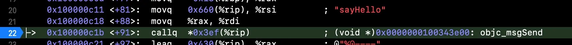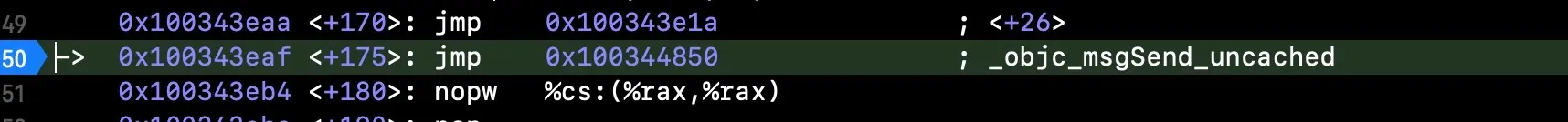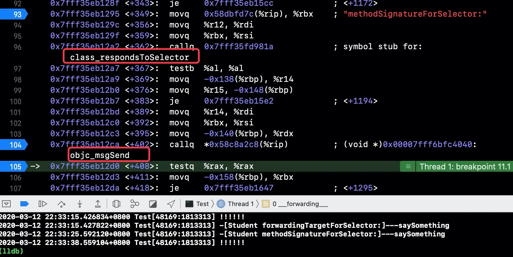 通过调试可以发现第二次调用 resolveInstanceMethod 是在返回方法签名之后执行的. 那么我们可以在返回方法签名处断点来通过汇编一步一步调试, 直至找到调用哪一条汇编才会出现的