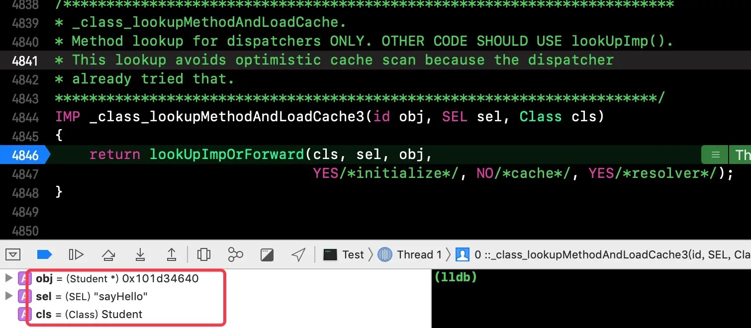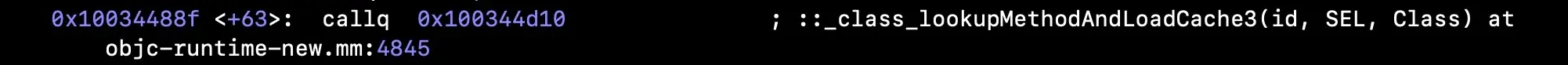通过全局搜索找到 _class_lookupMethodAndLoadCache3 方法, 在方法执行后加上断点进行调试: