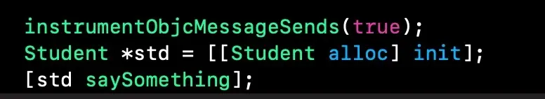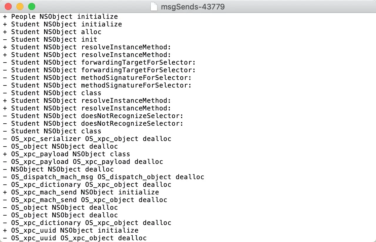 是通过 instrumentObjcMessageSends传递一个参数来告诉系统是否需要保存日志. 那么我们就在声明对象的时候调用 instrumentObjcMessageSends 来获取日志信息: