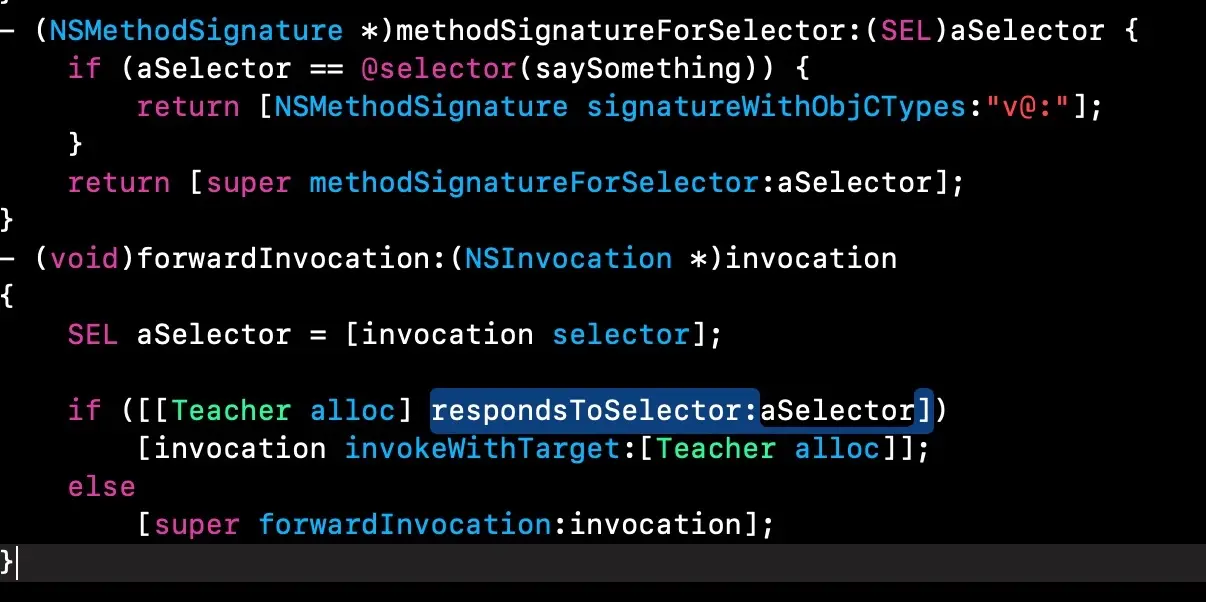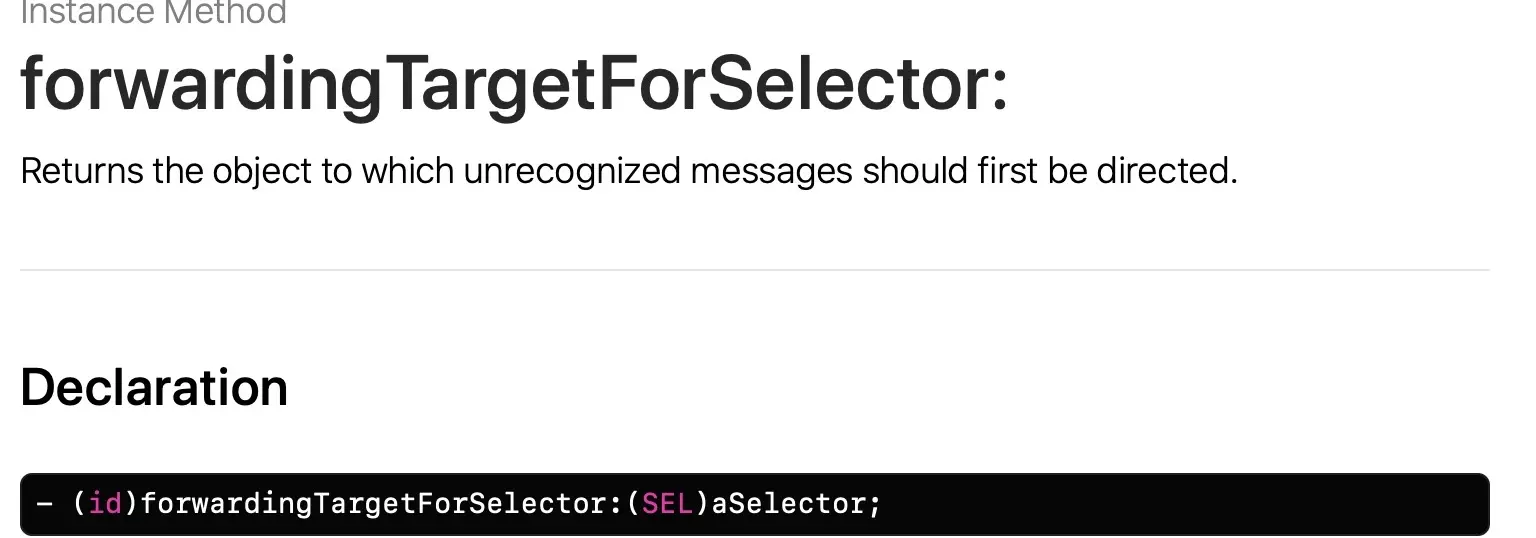 在动态方法决议之后, 又相继调用了 forwardingTargetForSelector和methodSignatureForSelector. 通过Developer Documentation中查找到相关方法: