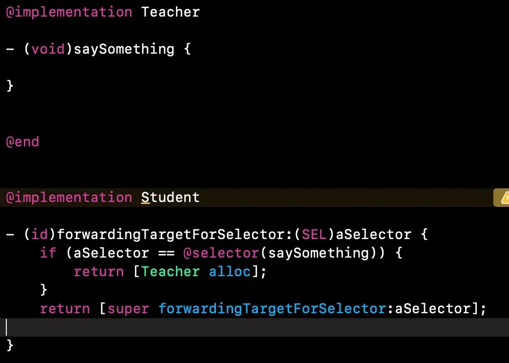 当系统找不到对应的sel方法时, 系统会去响应一个 resolveInstanceMethod 方法. 那么我们就可以这么做. 在自己类中重写这个方法: