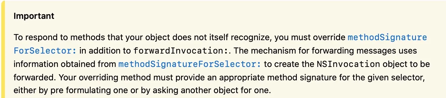 假如通过forwardingTargetForSelector将方法交给另一个类去处理, 另一个类也无法处理呢? 根据日志可以看到下面还有个methodSignatureForSelector. Developer Documentation中也有相应说明会走到forwardInvocation:这个流程.