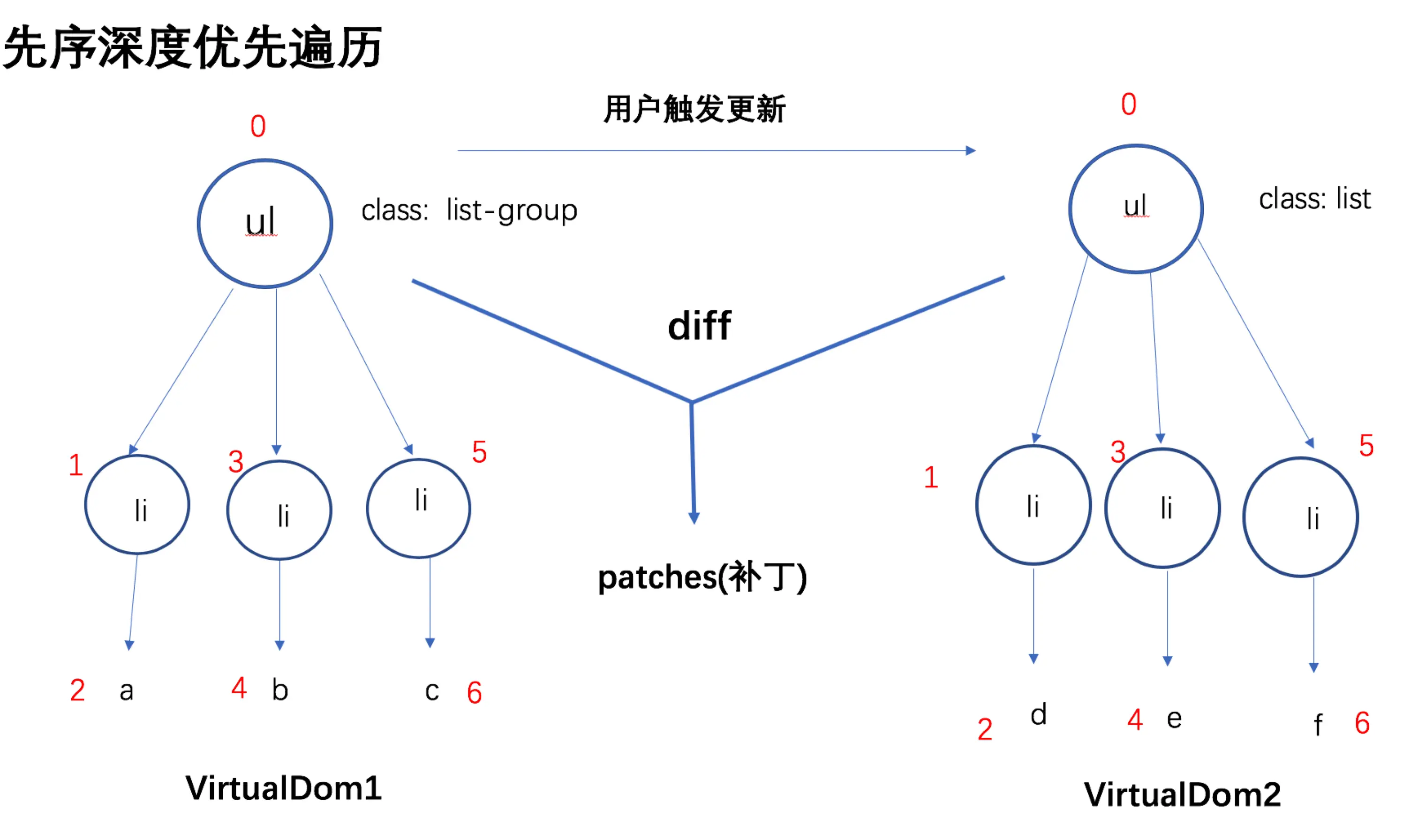 分析:接收两个虚拟Dom对象,通过深度优先遍历来进行比对(只比较同级节点,不跨级比较),每次遍历到一个节点,就记录一个索引值(从0递增),如果比对发现有差异,就把索引值对应需要执行的操作存起来