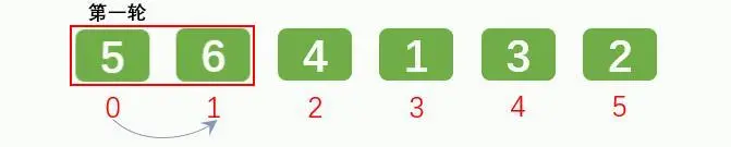 第一次相邻的元素6和元素5比较,发现前面的元素大于后面的元素,交换位置。