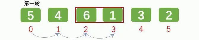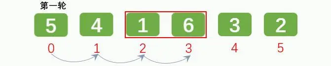 元素 6 和 1 比较, 比较后[5, 4, 1, 6, 3, 2]