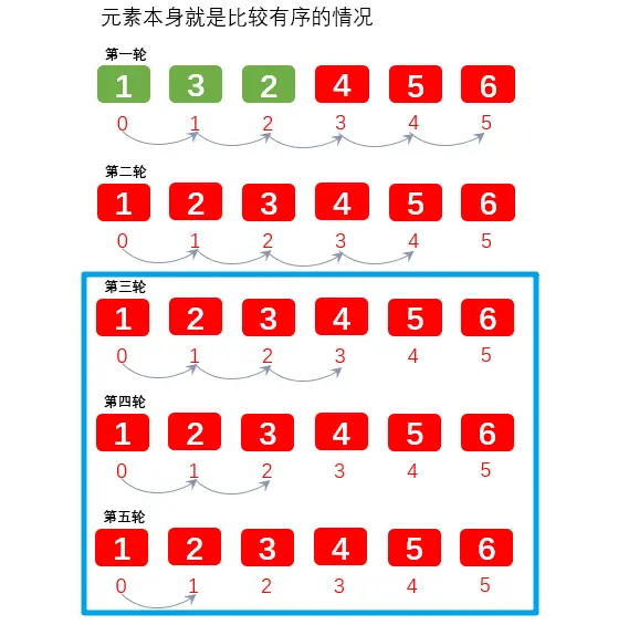 优化1: 如果有一轮发现没有需要排序的,说明已经有序了,可以不用再遍历比较了。如下图所示,第一轮比较过后,第二轮比较时发现元素已经全部是有序的,直接退出就没有必要再进行后面第三,第四,五轮的比较了。