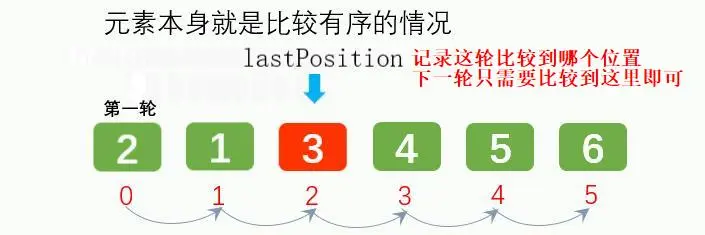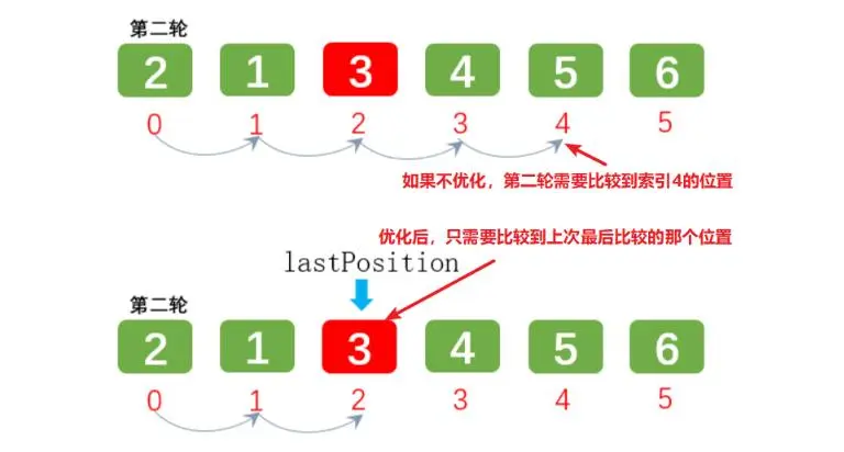 优化前第二轮需要比较到索引4的位置,优化后第二轮只需要比较到上次最后比较的那个位置,也就是lastPosition的位置
