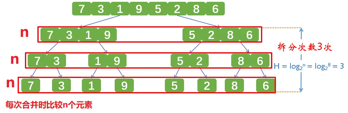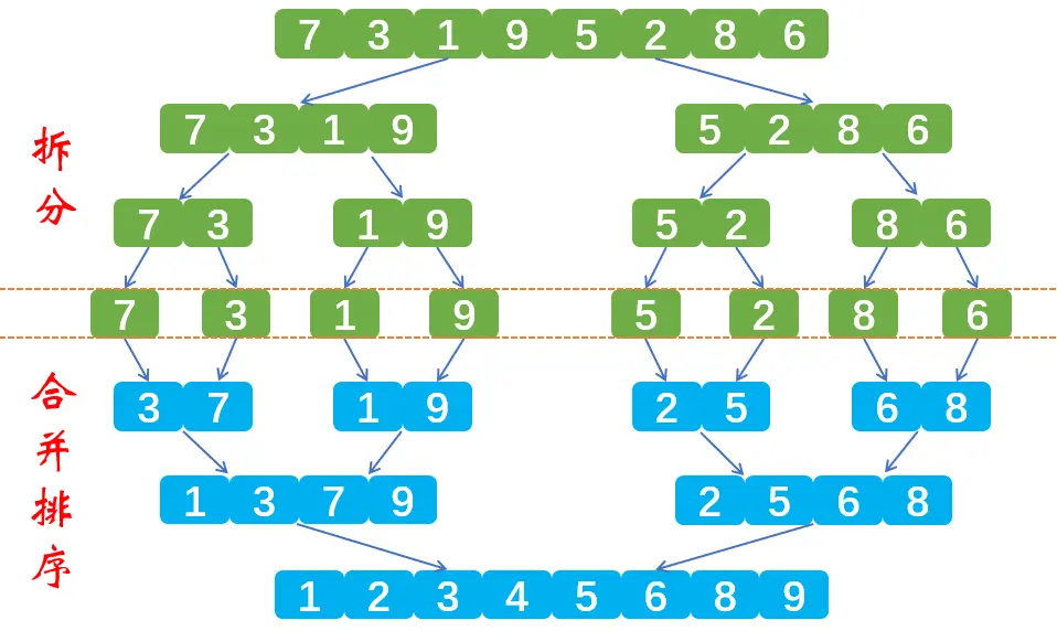 归并排序思想,将原数据序列分成大小相等的两个子序列,继续划分子序列,直到子序列有序时,将划分的有序子序列合并成大的有序序列,最终合并成一个有序序列。