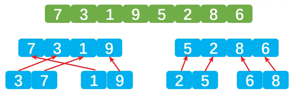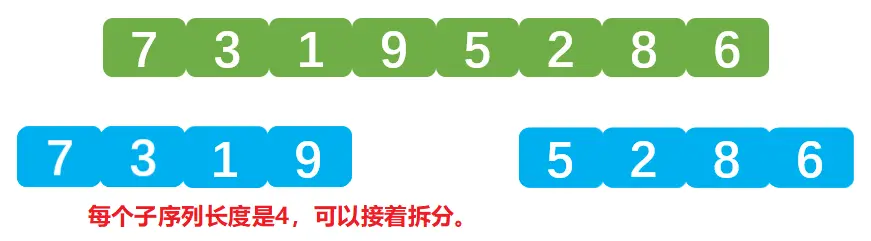当我们要排序由{7, 3, 1, 9, 5, 2, 8, 6}这样一个数组的时候,归并排序法首先将这个数组分成两半。