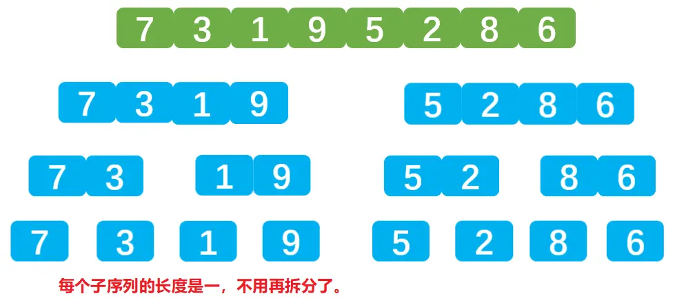拆分后的效果如上图,经过这次拆分后,每个子数组的长度被为1,我们认为长度为1的子数组是有序的。不需要再进行拆分了。到此拆分就结束了。