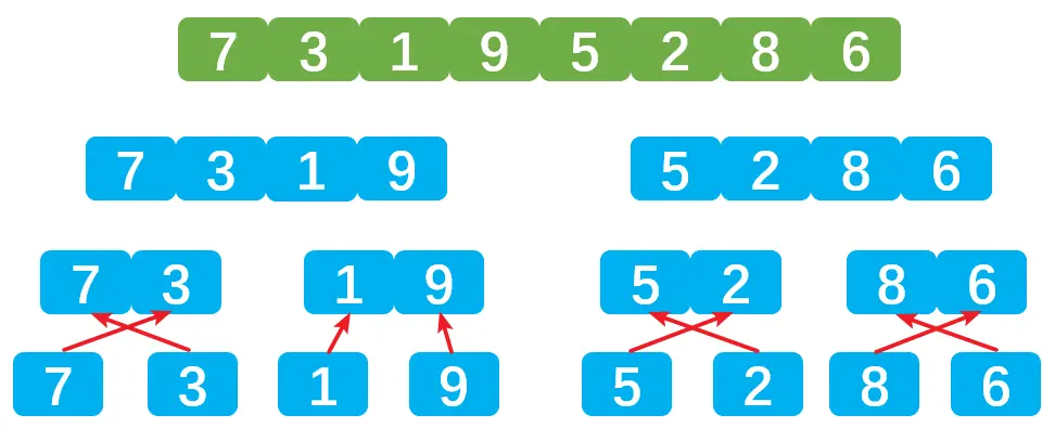 - 循环:子序列长度从1开始,循环让子序列长度是原先的两倍,不断进行合并排序。