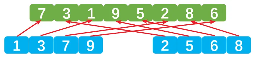 到现在每个子数组长度为4,是有序的子数组,需要将两个长度为4有序的子数组合并成一个长度为8的有序数组。