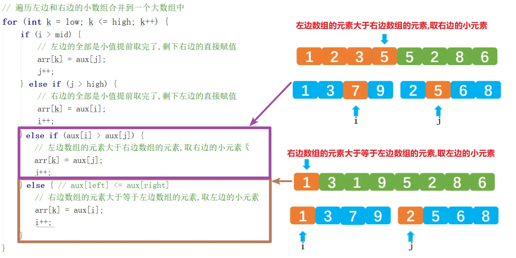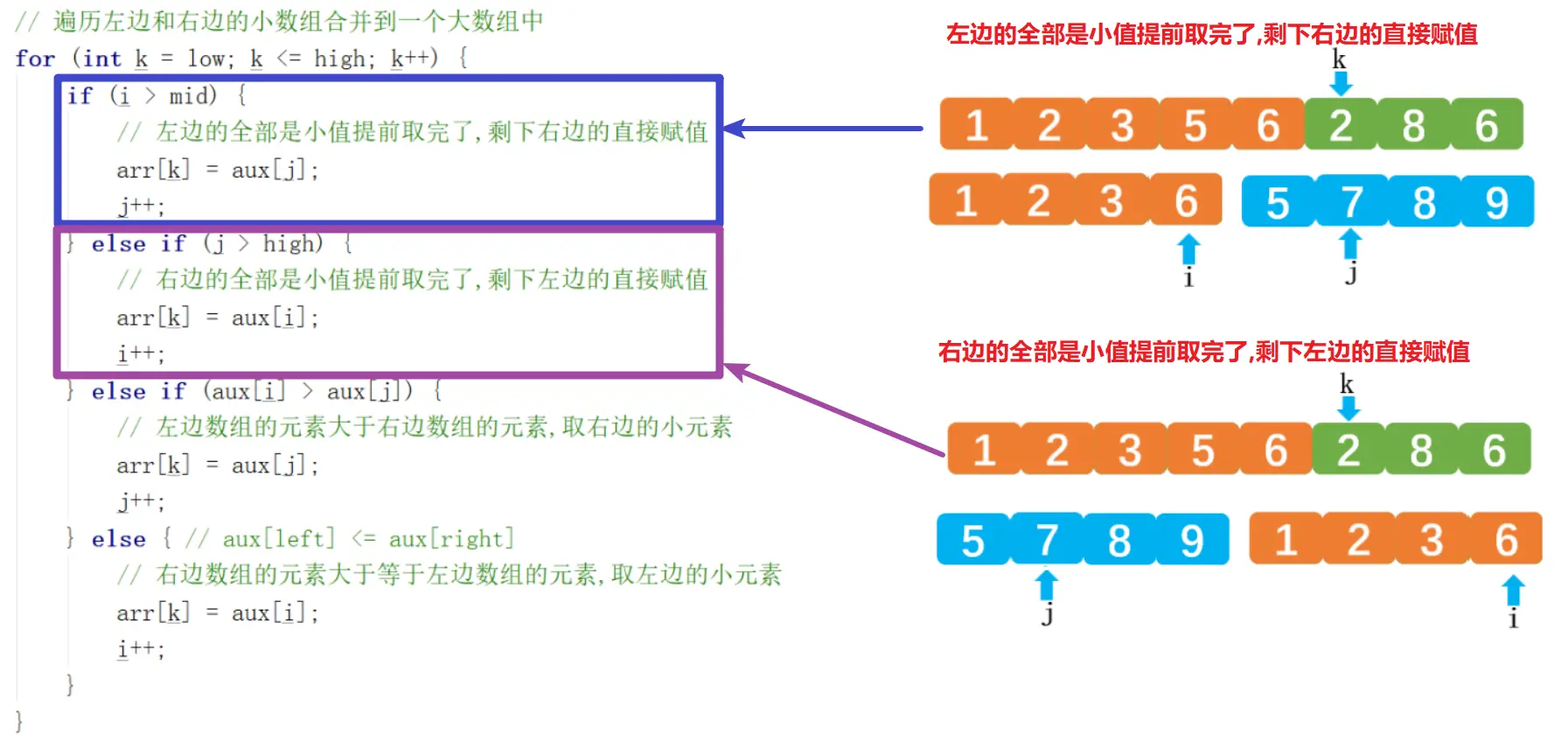 // 临时数组的内容就是两个待排序数组的内容,排好序的内容会放到arr中