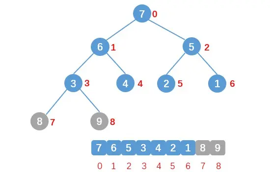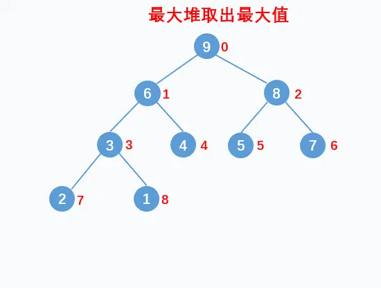 如上图所示,当我们将堆顶的最大值9移除后,堆中的第二大值8就会到堆顶来。当我们再次将8移除后,堆中剩余元素的最大值会到堆顶来。