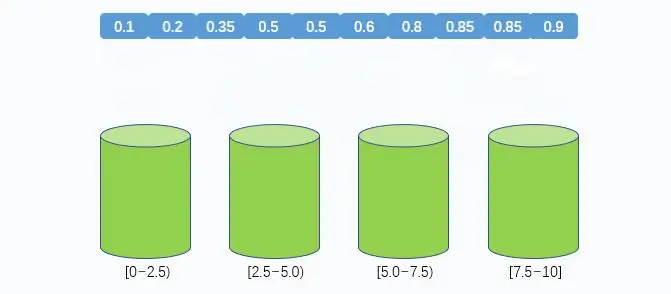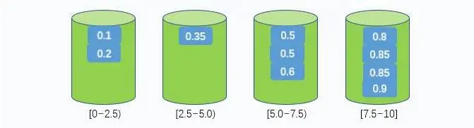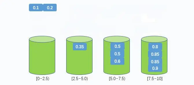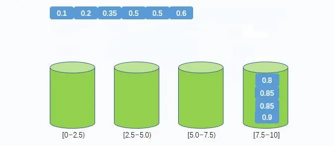 关于如何划分合适数量的桶,根据不同规模和不同范围的数据,我们采取不同的划分方式。目前数据都是0到1之间小数,数据比较均匀,我们等分成4个桶,每个桶的范围都是0.25,效果如下: