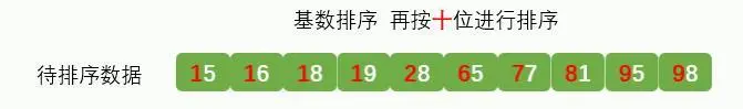 假设有{16, 28, 19, 65, 95, 98, 81, 77, 18, 15}这10个数据。一般没有特殊要求排序算法都是升序排序,小的在前,大的在后,效果如下:
