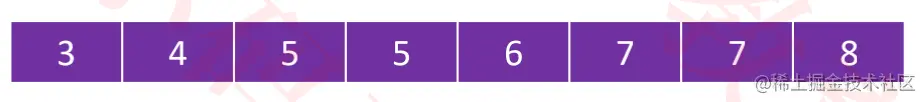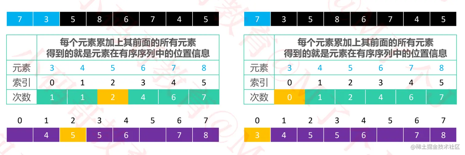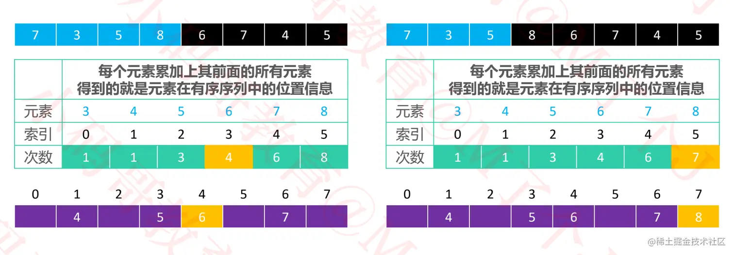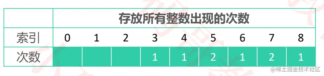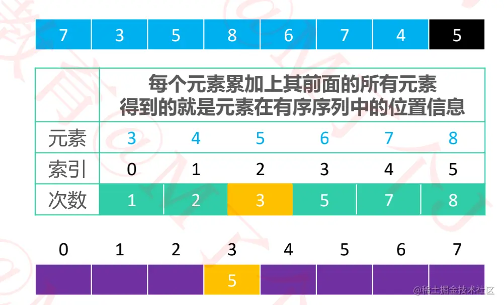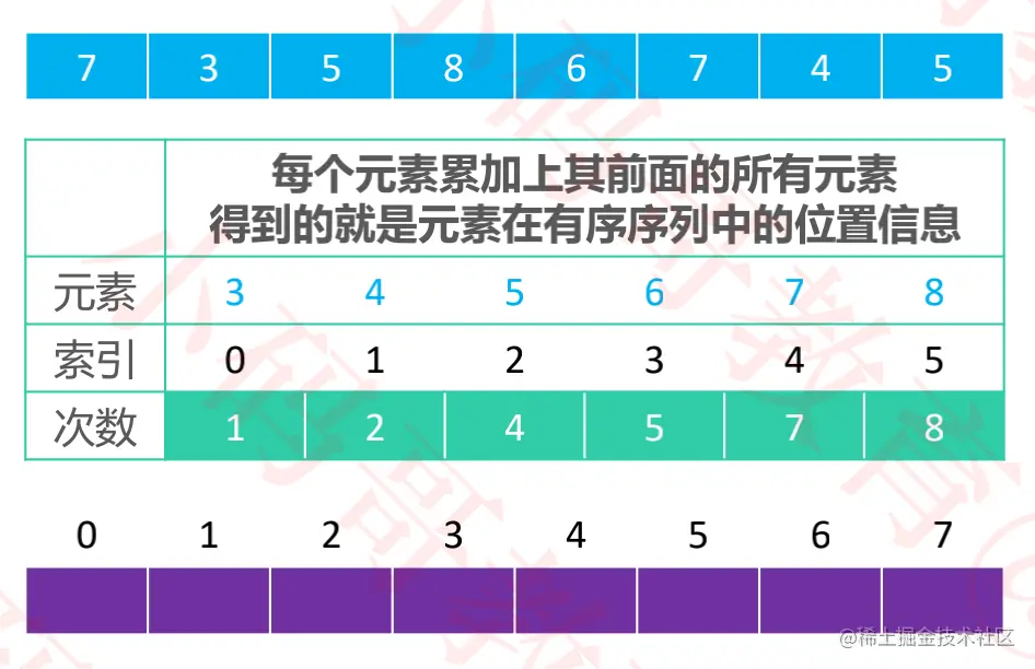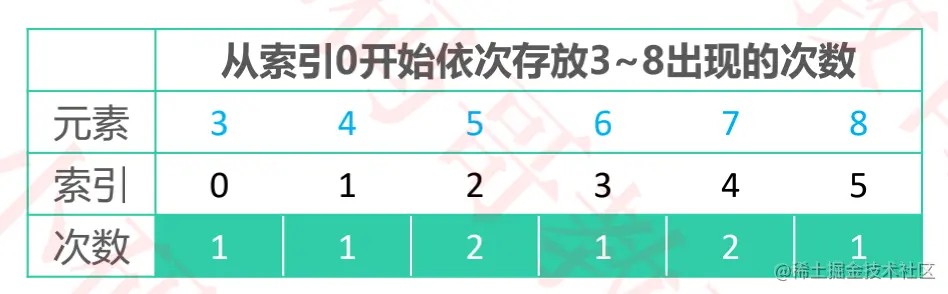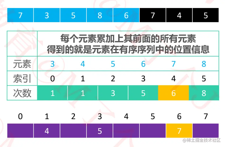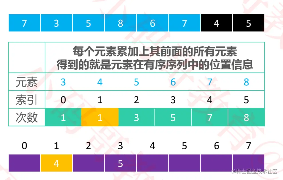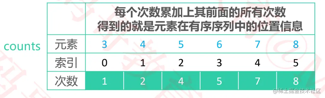 3-8之间的数即可,则实际需要的数组空间为:max - min + 1。 - 将每个元素出现的次数累加上其前面的所有次数,得到的就是元素在有序序列中的位置信息。