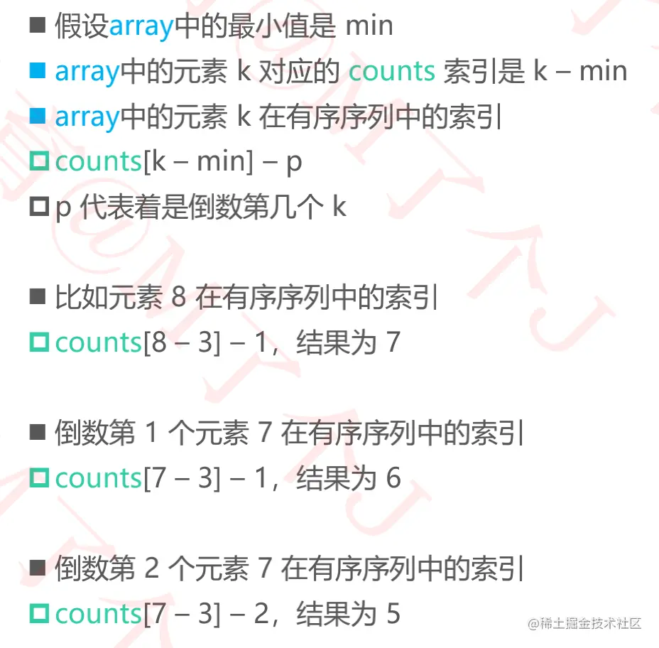蓝色数组array,即可获得绿色counts数组,为了排序我们再新建一个紫色数组。 - 从后往前遍历数组,首先是元素