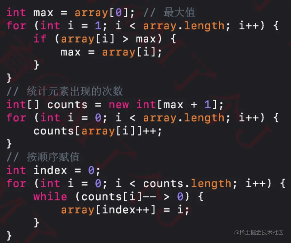 O(nlogn)更低。 - 计数排序的思想是,统计每个整数在序列中出现的次数,进而推导出每个整数在有序序列中的索引。