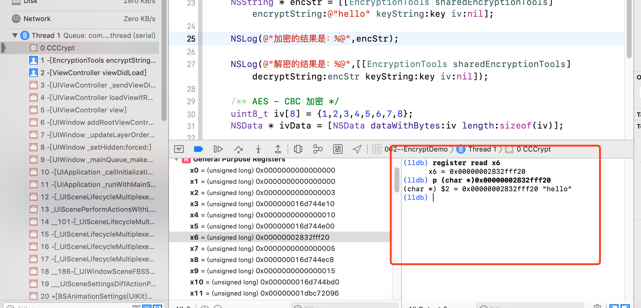 我们可以通过符号断点拦截到系统函数CCCrypt,因为加密的数据在第七个参数,所以我们可以看一下寄存器x6的数据