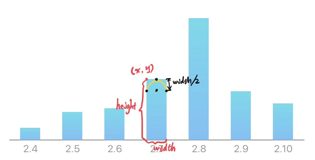function CustomBar(props) { const { fill, x, y, width, height } = props; const radius = width / 2; const d = `M${x},${y + height} L${x},${y + radius} A${radius},${radius} 0 0 1 ${x + width},${y + radius} L${x + width},${y + height} Z`; return ( <path d={d} stroke="none" fill={fill} /> );}(x, y) 指的是柱子左上角的坐标。
