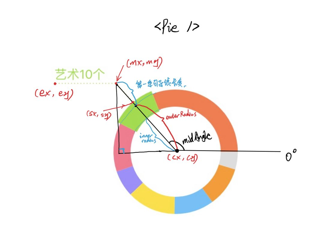 const { cx, cy, innerRadius, outerRadius, startAngle, endAngle, midAngle, fill, value, name} = props;涉及到的圆心坐标、角度、半径等参数的含义如图: