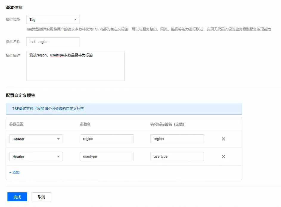 创建插件类型为 tag 类型插件,将请求参数中 Header 参数中的 region、usertype 设置为标签