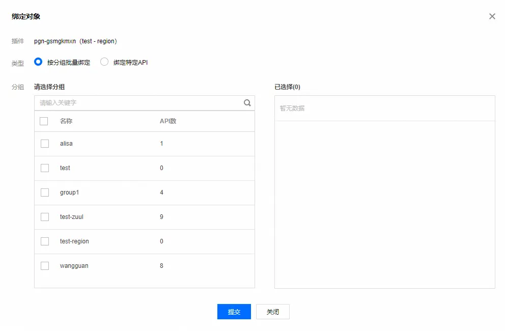 在插件列表页面将创建好的插件与准备工作中创建的分组进行绑定