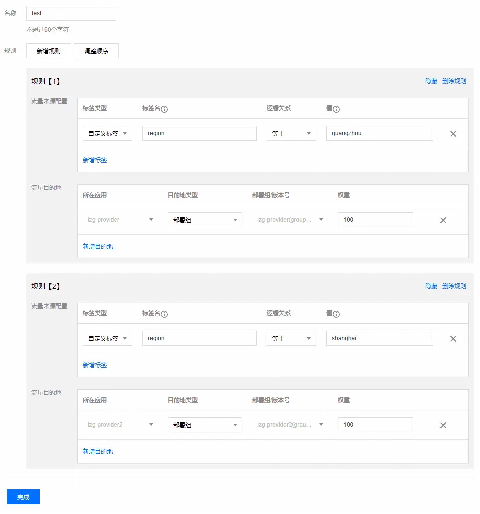 创建两条规则,当自定义标签region值为guangzhou时,100%的流量指向部署了provider-demo-guangzhou.jar的部署组,当自定义标签region值为shanghai时,100%的流量指向部署了provider-demo-shanghai.jar的部署组。规则配置可参考下图: