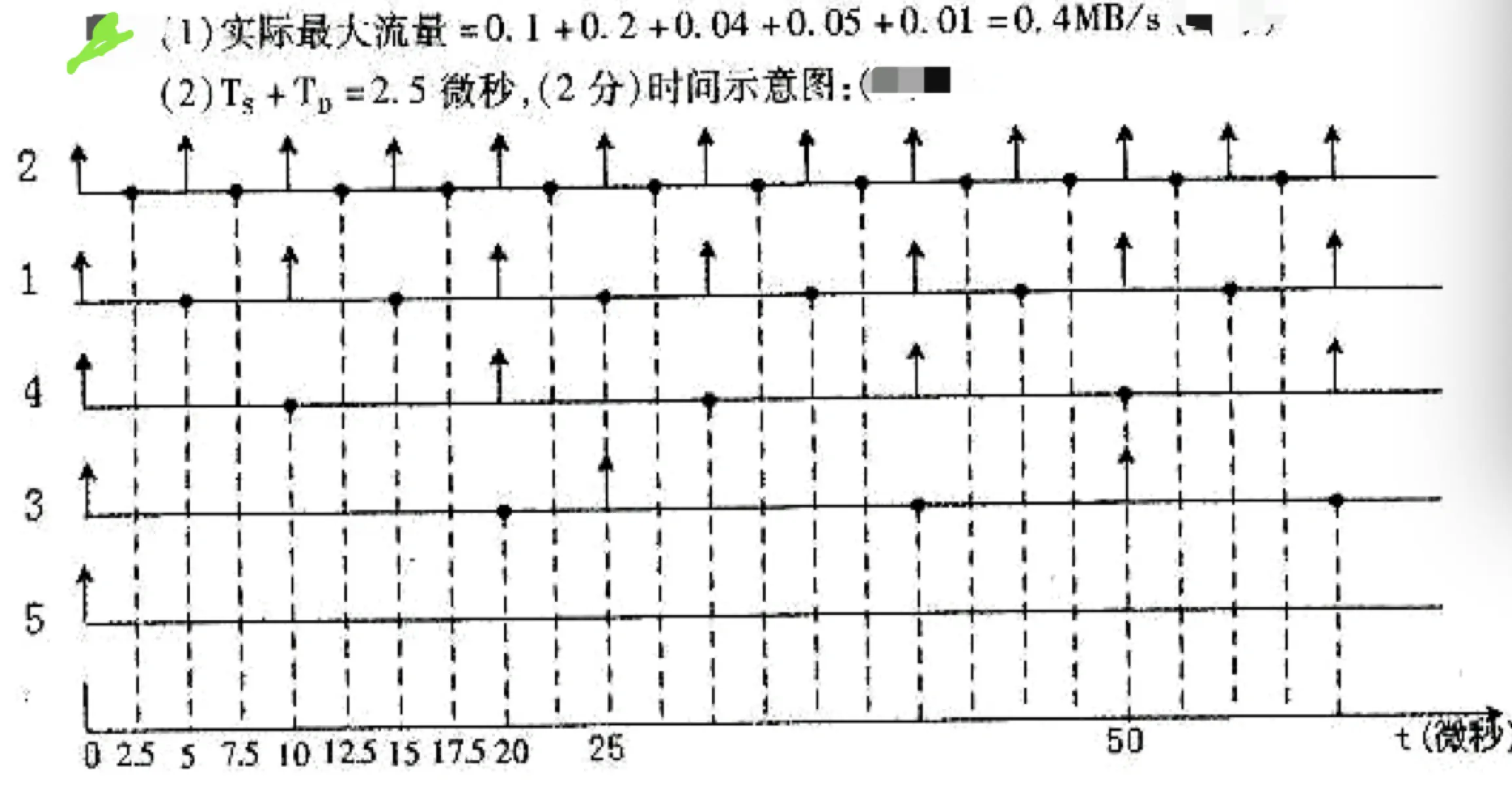 (2)如果设计的通道工作周期使通道极限流量恰好与通道最大实际流量相等,以满足流量设计的基本要求,同时让传送速率越高的设备响应的优先级越高。从5台设备同时发出请求开始,画出此通道响应和处理各设备请求的时间示意图。