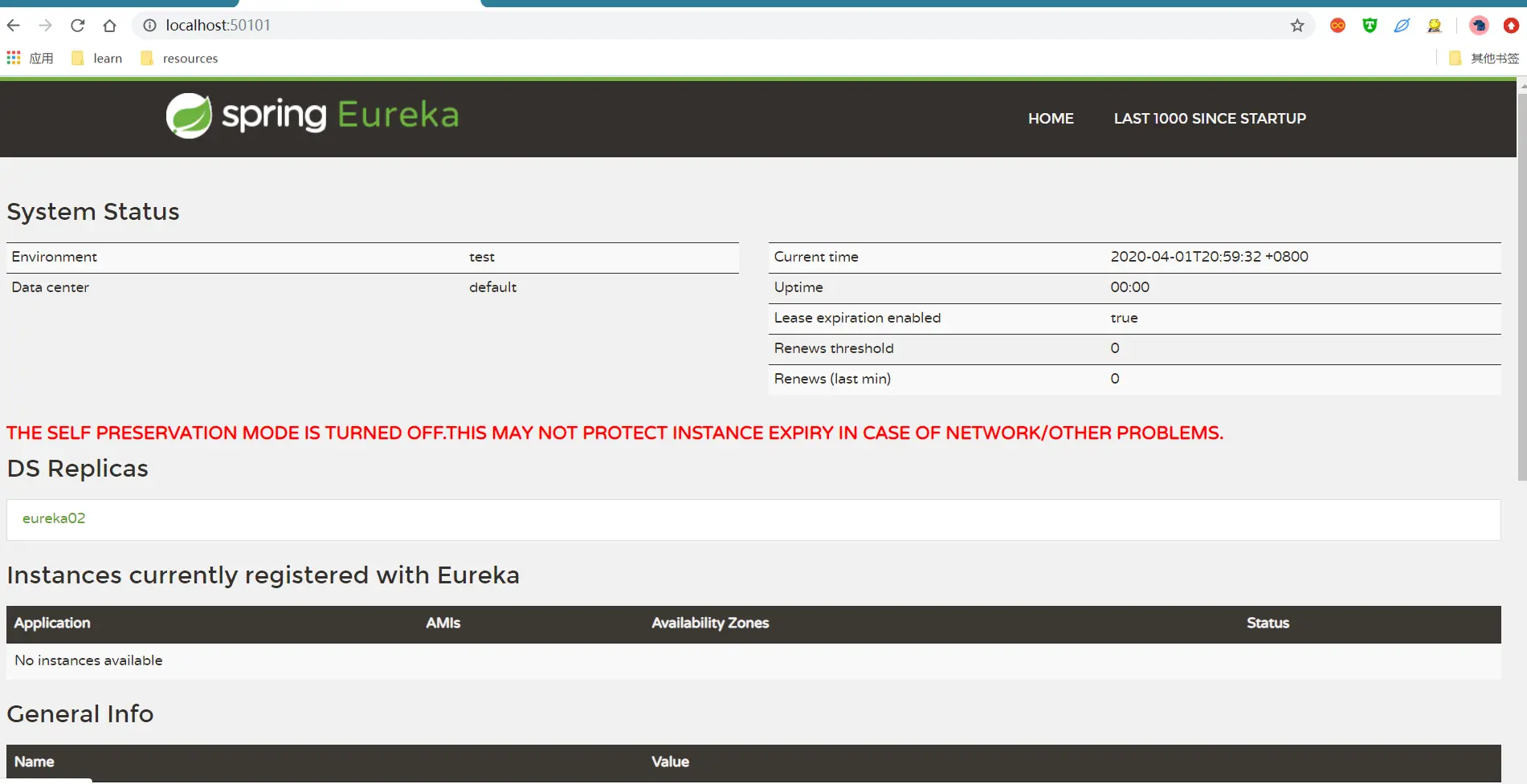 上图红色提示信息: THE SELF PRESERVATION MODE IS TURNED OFF.THIS MAY NOT PROTECT INSTANCE EXPIRY IN CASE OF NETWORK/OTHER PROBLEMS. 自我保护模式被关闭。在网络或其他问题的情况下可能不会保护实例失效。