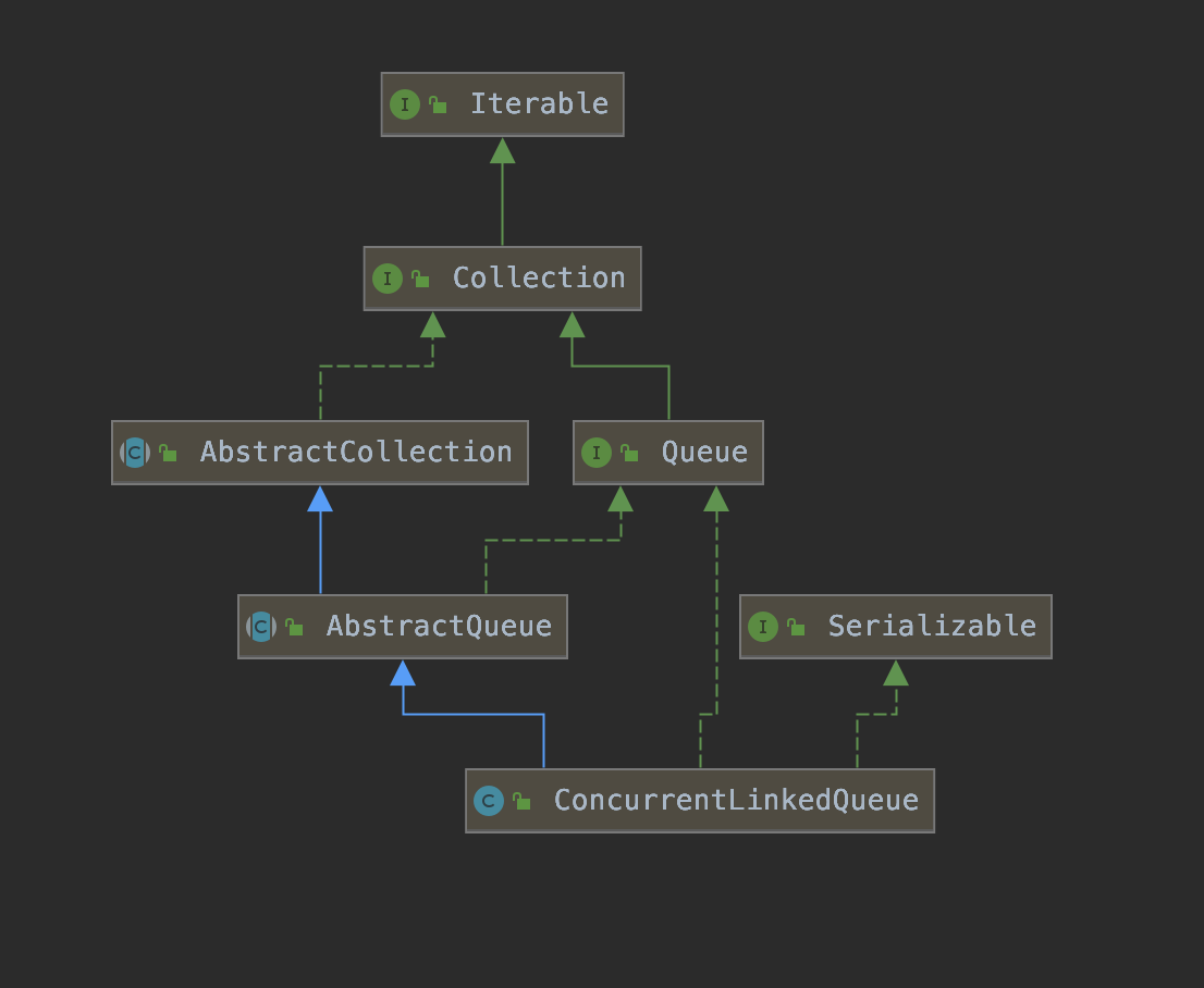 ConcurrentLinkedQueue使用单向链表实现,对于出队和入队的操作使用CAS+自旋来实现线程安全。