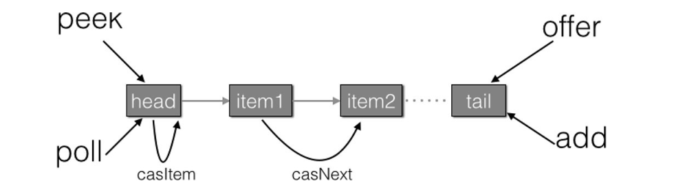 类内部有两个volatile修饰的Node节点,用来存储头节点和尾节点。由于使用的是CAS无阻塞的算法所以入队和出队不会阻塞线程。入队和出队的时候会使用UnSafe的工具类,调用CAS进行Node节点的设置,如入队会将尾节点从null设置为新插入的Node引用,如果设置成功,则返回,如果不成功,说明有其他线程先行成功了CAS已经插入了一个节点,那么会进行循环自旋,直至设置成功。出队同理。相比阻塞算法,这个是CPU资源换取阻塞带来的开销。