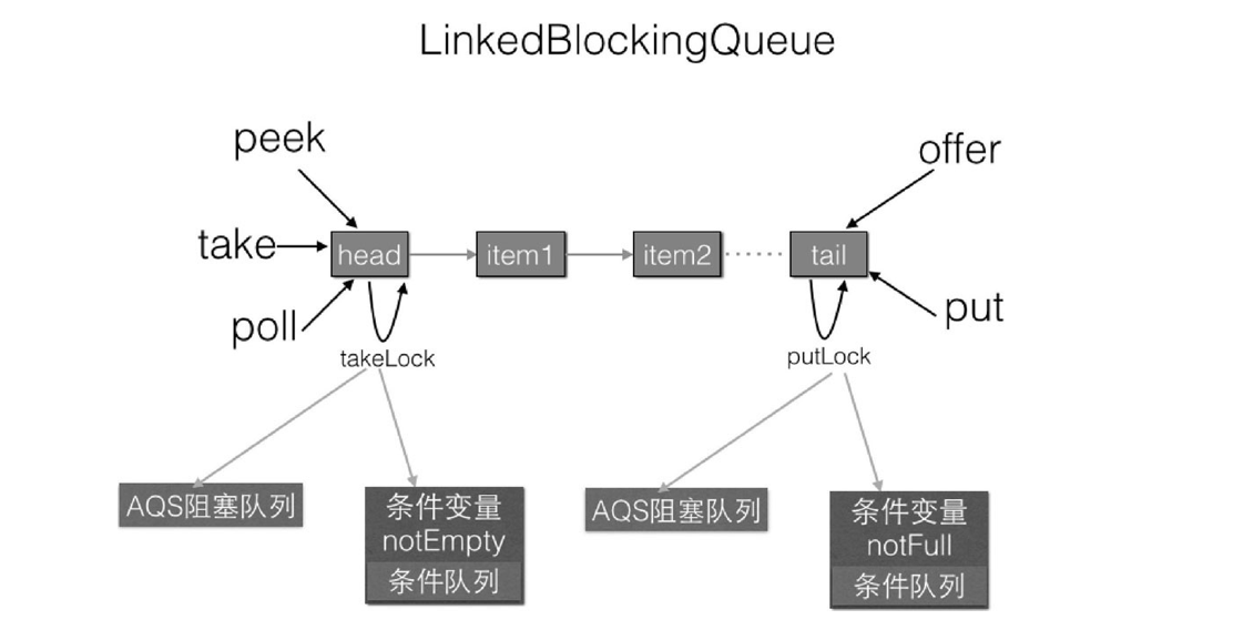 队头尾节点分别使用了独占锁,来保证原子性,所以出队入队可以同时进行,对两个独占锁配备了各自的条件队列,来存放阻塞线程,并结合出队入队操作,来实现了生产者消费者的模型。