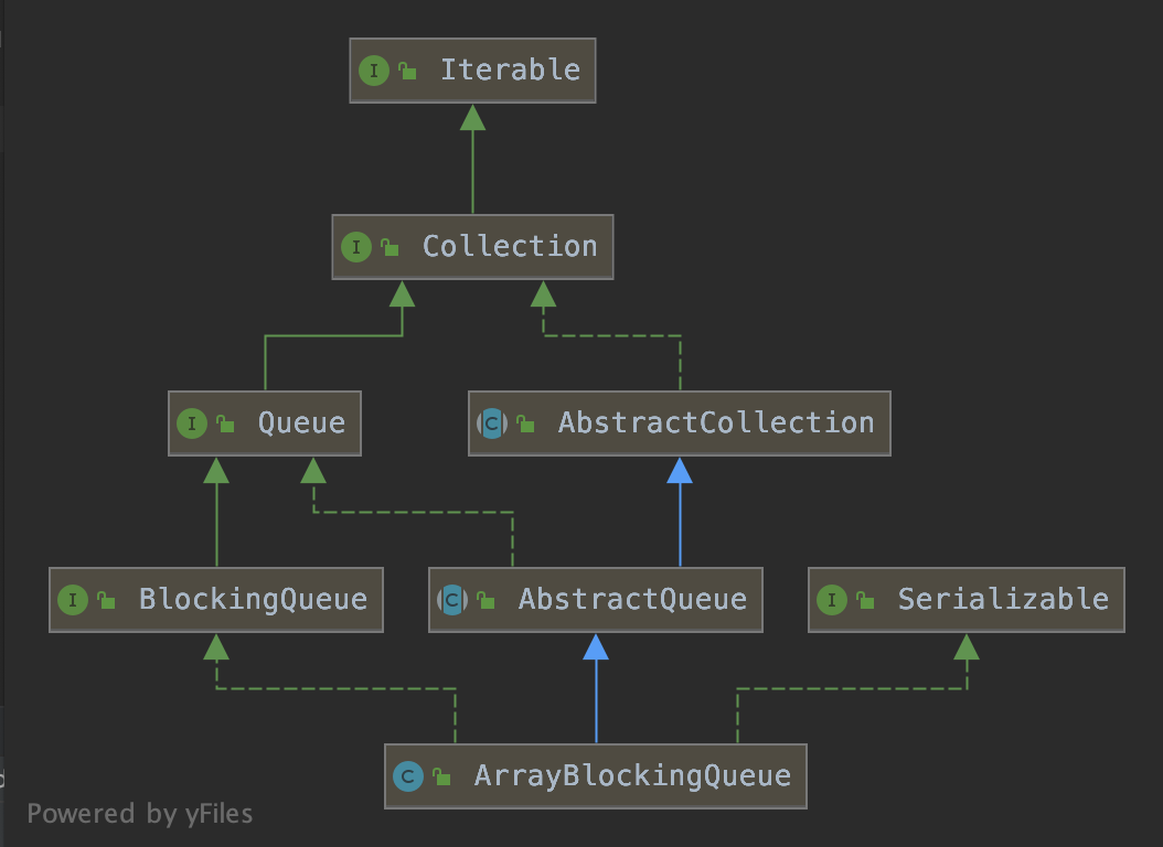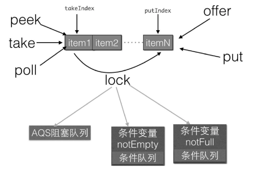 ArrayBlockingQueue使用有界数组的方式来实现队列。其中有一个独占锁Reentrantlock来保证入队出队操作的原子性,另外有两个notEmpty和notFull的条件变量,来实现入队出队操作的同步生产消费者模型。