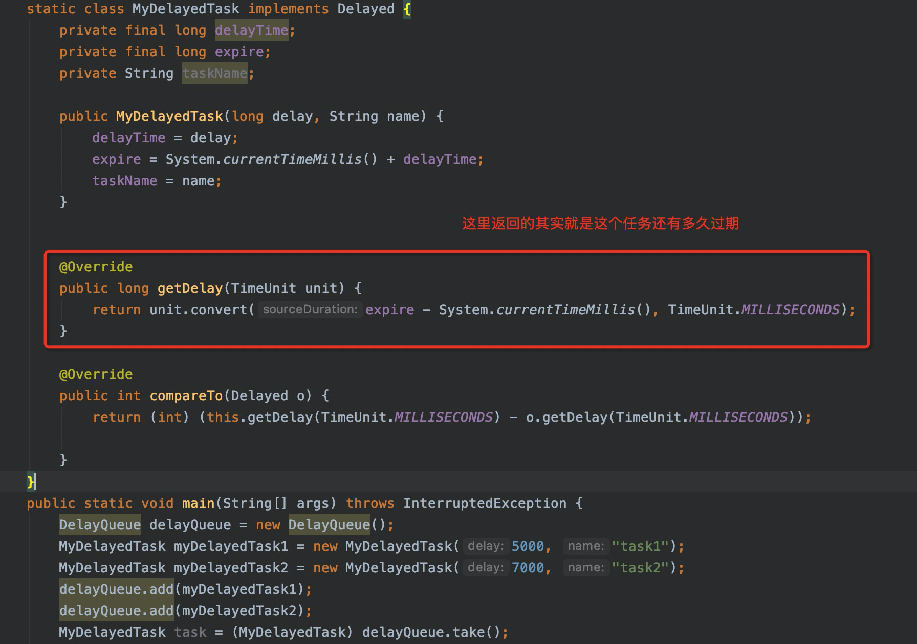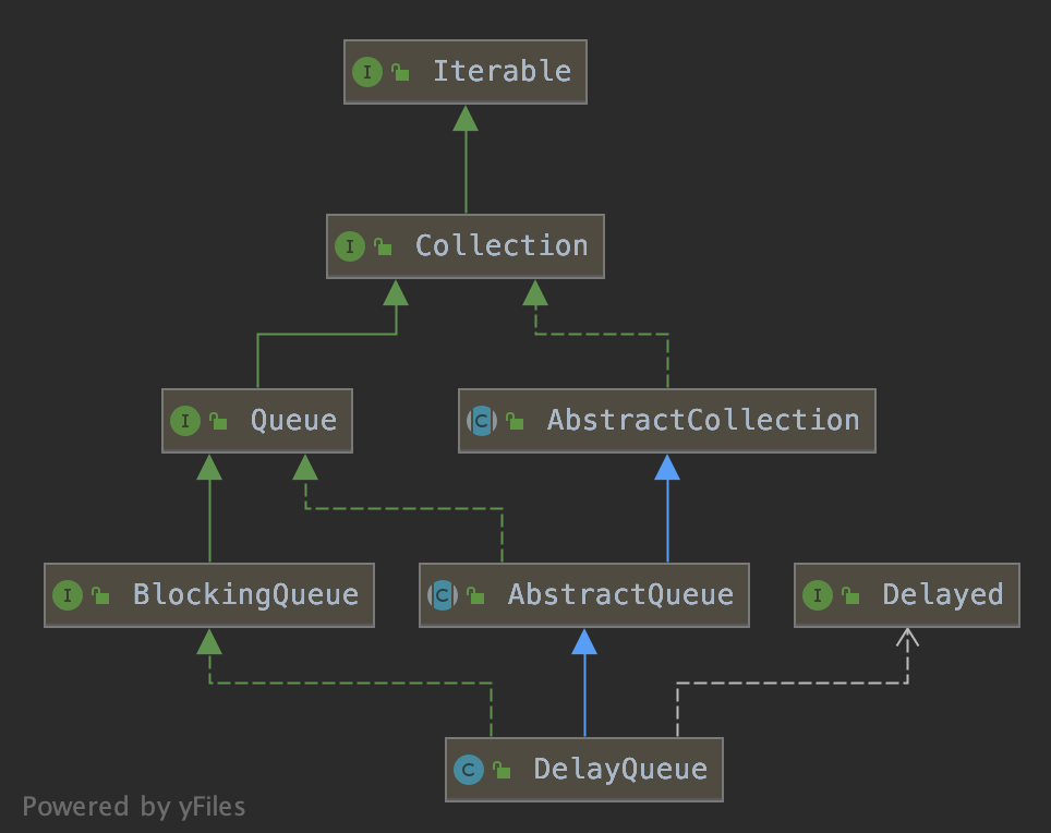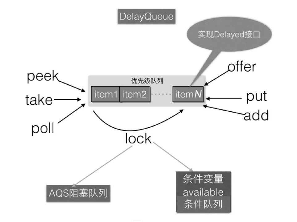 DelayQueue使用PriorityQueue存放数据,使用ReentrantLock来实现线程同步。另外,队列里面的元素需要实现Delayed接口,一个方法是用来返回过期的剩余时间,一个是用来比较元素优先级。